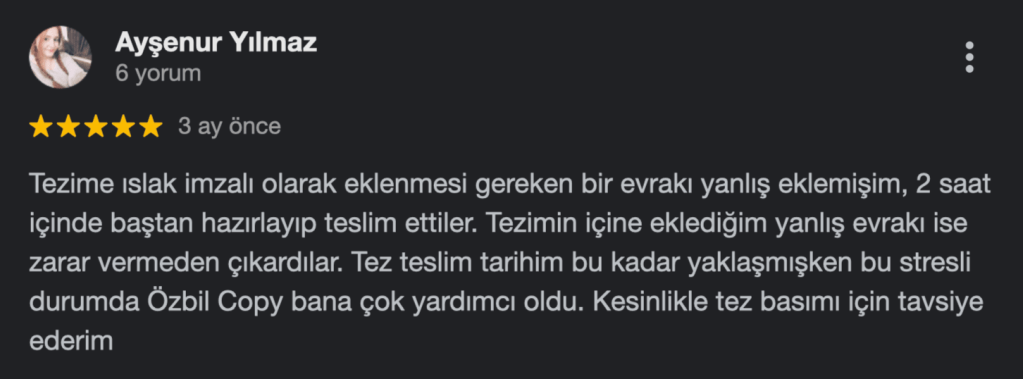Bize tezinizi PDF olarak atınız. Tezinizin çıktısı ve kapağı gibi gerekli olan işlemleri yapacağız fakat tezinizi basmayacağız. Tezinizi gelip almanız için size verdiğimiz tarihte “hocalar tarafından İMZALANMIŞ imza kağıdını” bize getirdiğinizde imza kağıdınızı tezinize ekleyip 20-30 dakika içinde tezinizi teslim edeceğiz. Böylelikle bize çok daha önce imza sayfasını getirmenize gerek kalmayacak.