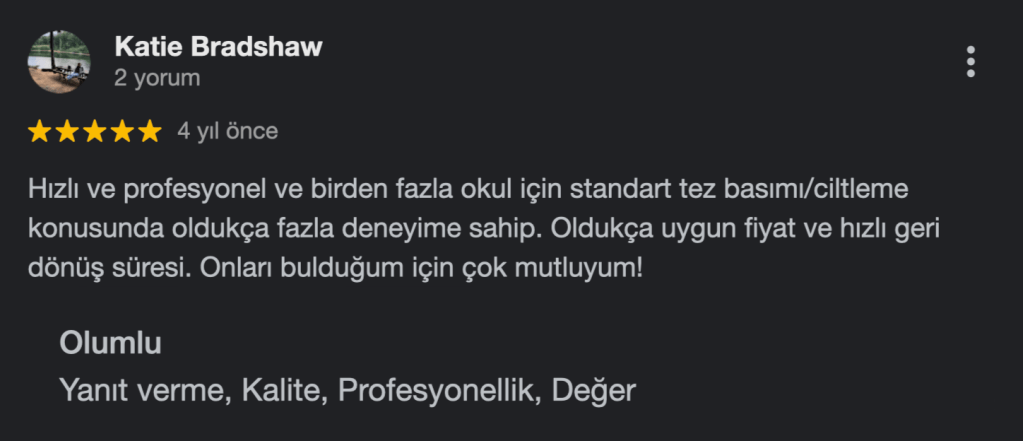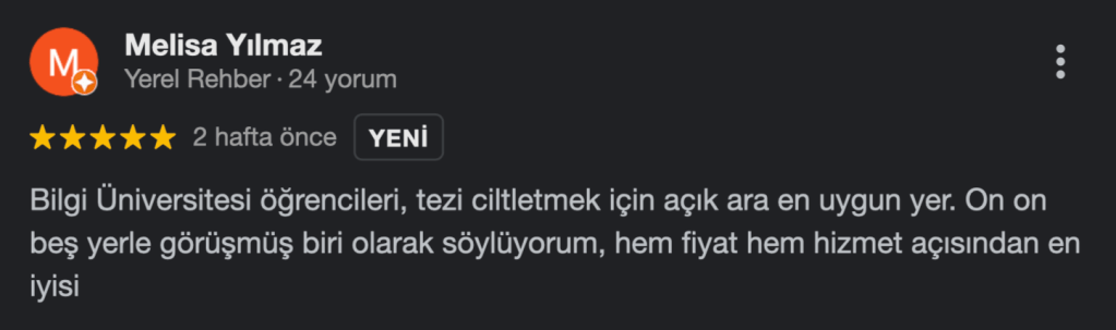Beşiktaş’ta 30 yılı aşkın süredir tüm üniversitelerin Yüksek Lisans ve Doktora Tezleri‘nin ciltlerini yapmaktayız. Bu zamana kadar onbinlerce tez ile edindiğimiz tecrübe ile öğrencilerin yaşadığı stresi biliyor ve gönül rahatlığıyla tezlerini hızlı bir şekilde teslim etmesini sağlıyoruz. İşimizi kaliteli şekilde yapmanın getirmiş olduğu namın perde arkasında tez detaylarına hakimiyetimiz, iletişimimiz ve hızımız yer alıyor.