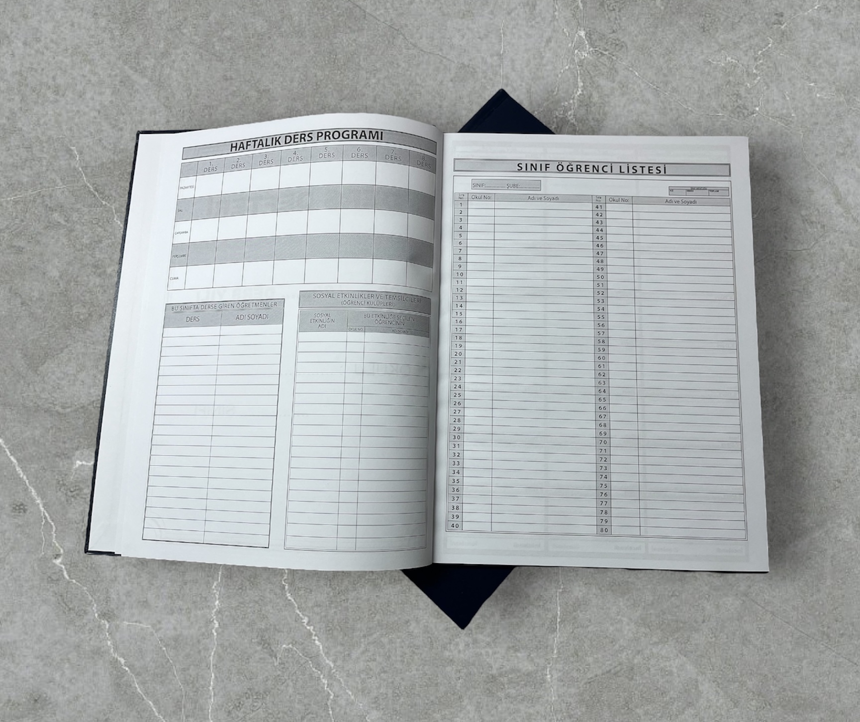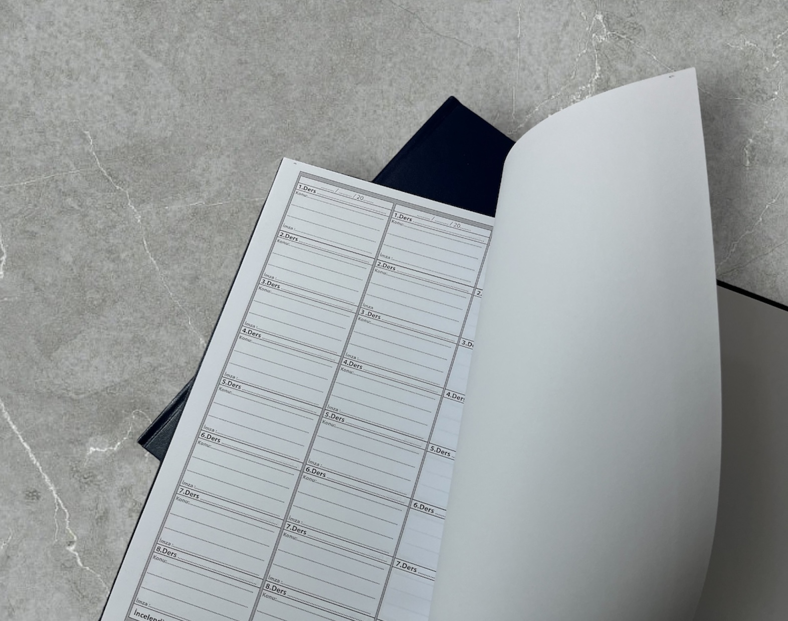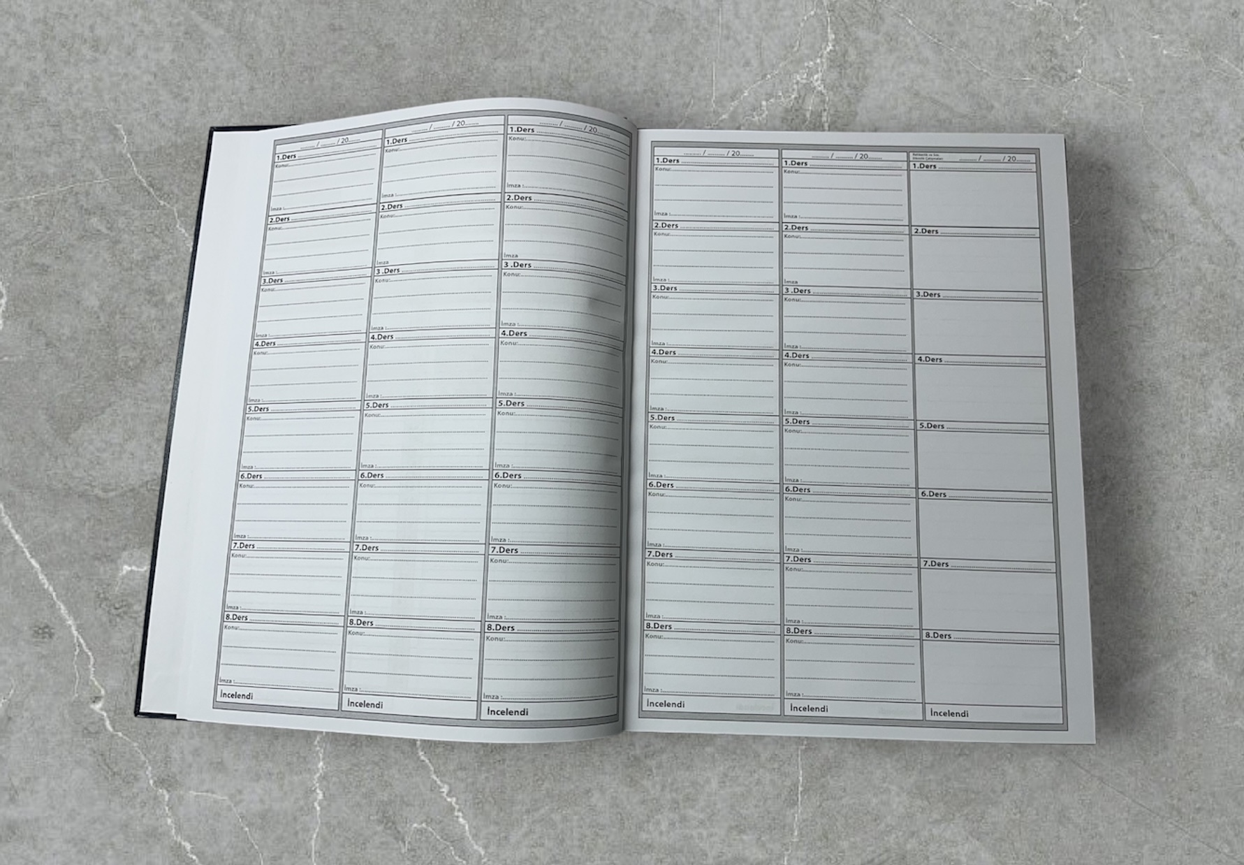 Kalan diğer tüm sayfalarında ise 1. dersten 8. derse kadar Tarih, Konu ve İmza kısımları yer alan öğretmenler için hazırlanmış sert kapaklı ve ciltli Ders Defteri’dir. Yıl boyunca kullanılan sınıf defteri ciltli yapısı ile korunaklı ve uzun ömürlü olur. (Boyut 25×33 cm)