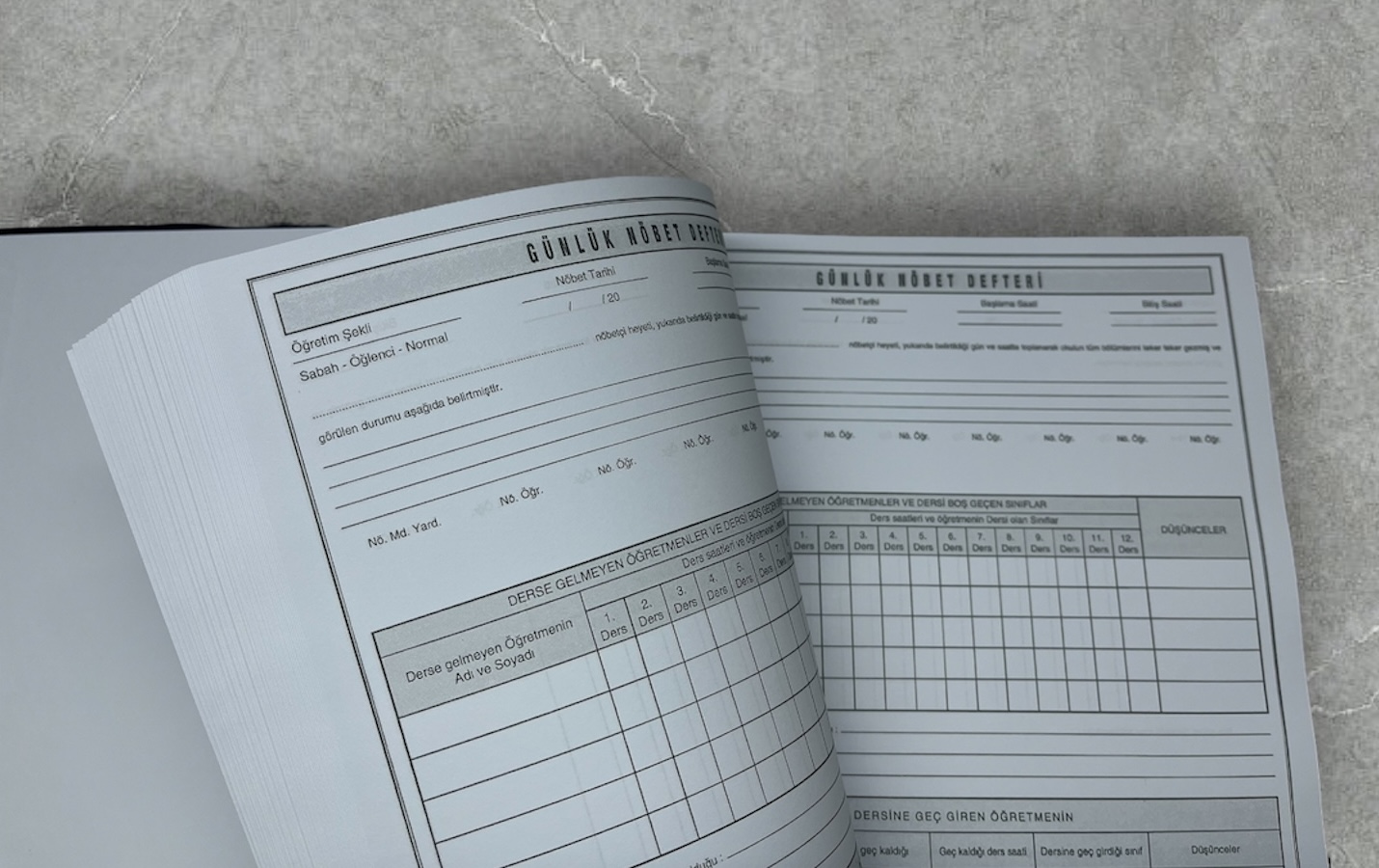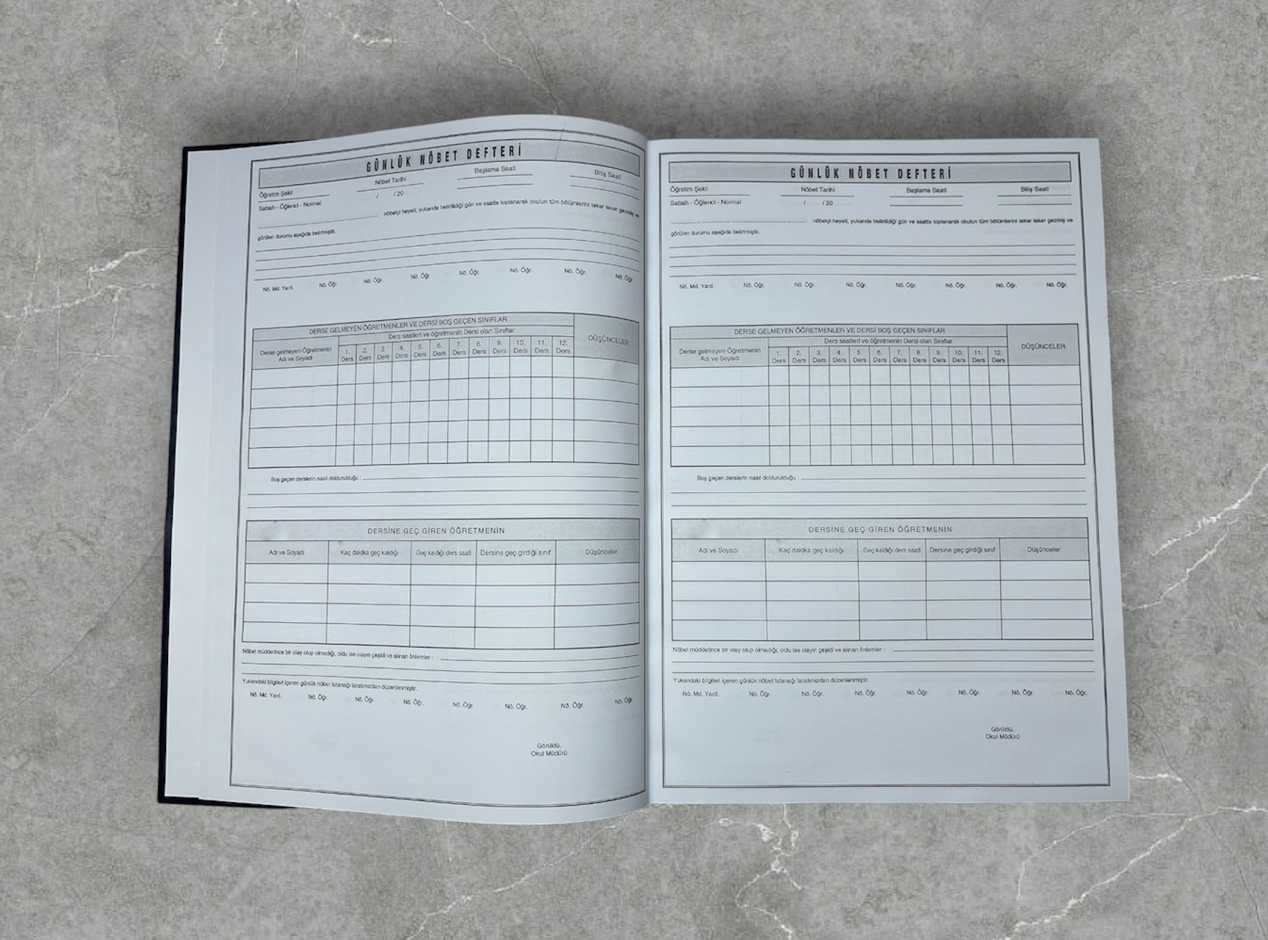 Sert kapaklı ve yaldız baskılı ciltlenmiş, okullar için hazırlanmış Nöbetçi Defteri’dir.